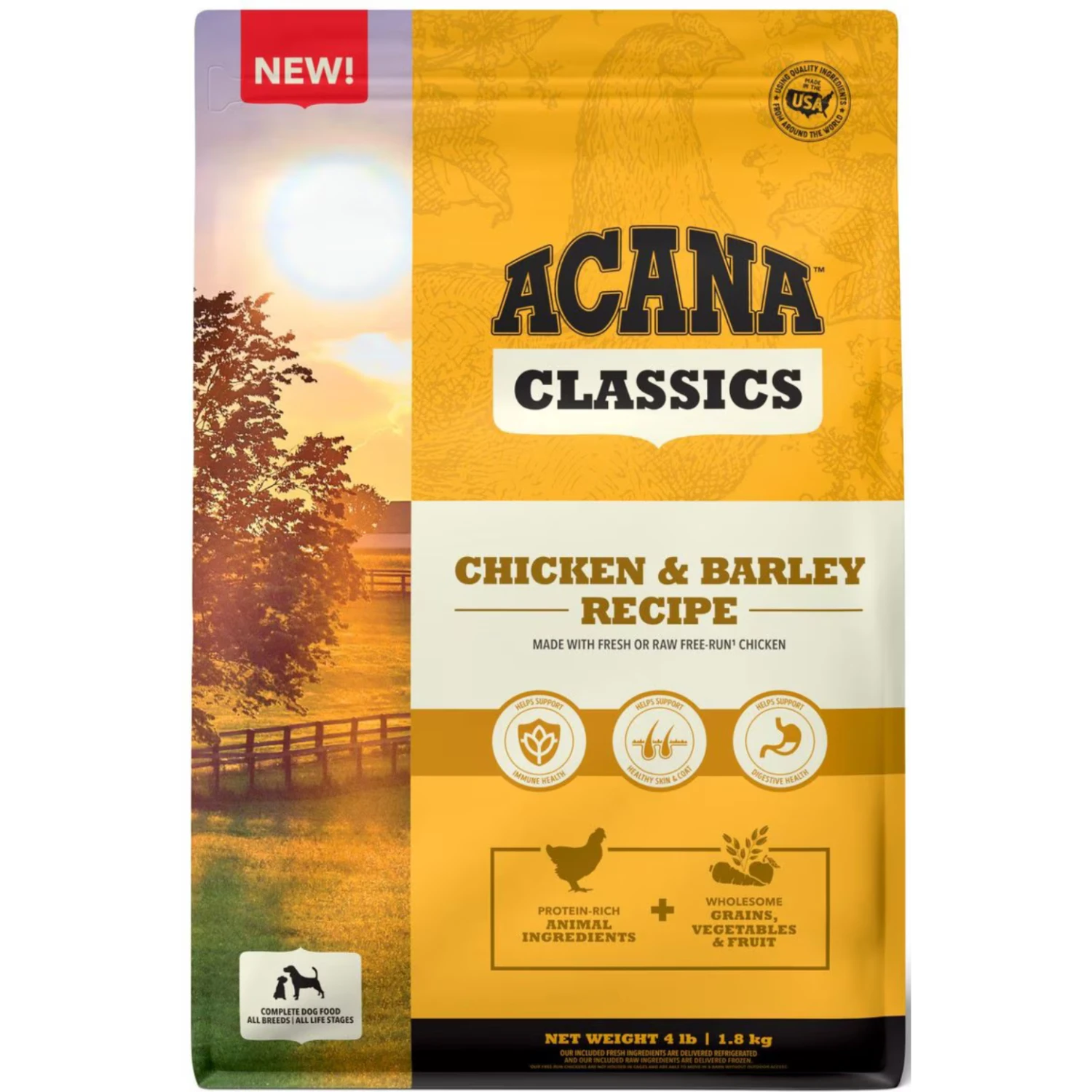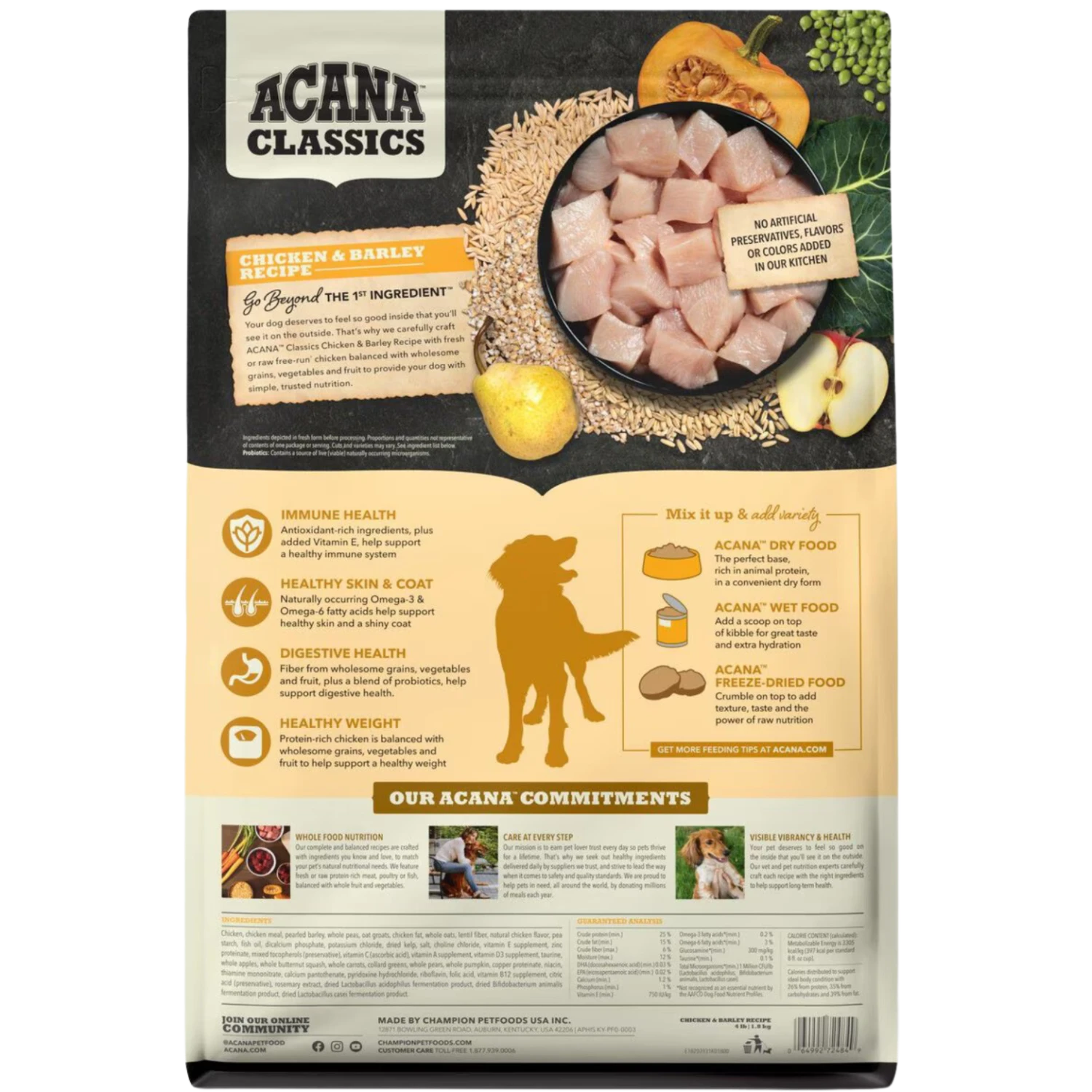 Help your dog feel so good inside, you’ll see it on the outside! Nurture your dog with the simple nutrition and wholesome ingredients in ACANA™ Classics Chicken & Barley Recipe. Crafted with protein-rich fresh or raw free-run* chicken, this recipe is balanced with wholesome grains, vegetables & fruit, and it contains no artificial preservatives, colors or flavors. Your dog will love its delicious taste, and you’ll love that its nutritious ingredients help support 4 key health benefits, including Immune Health, Healthy Skin & Coat, Digestive Health and Healthy Weight.