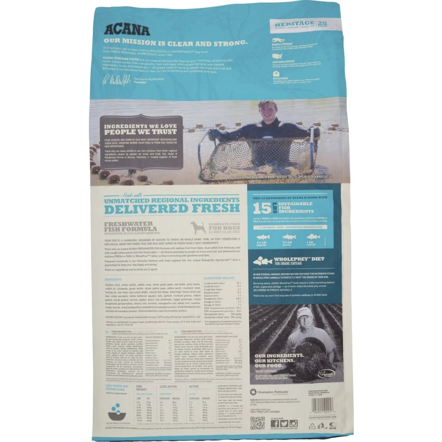 Our ACANA®recipes are thoughtfully crafted recipes from start to finish. ACANA Freshwater Fish recipe is balanced with 60%* quality animal ingredients like rainbow trout, catfish, and perch, and 40%+ fruits, vegetables, and botanicals. Artificial colors, flavors or preservatives are never added in our kitchen. Our premium ingredients come from a curated group of farmers, ranchers and fishers we’ve known and trusted for decades, and we approach every batch with an unsurpassed commitment to safety and quality in our award-winning Kentucky kitchen. The result is a protein-rich, nutritious, and delicious dog food to help them live a healthy, happy life.