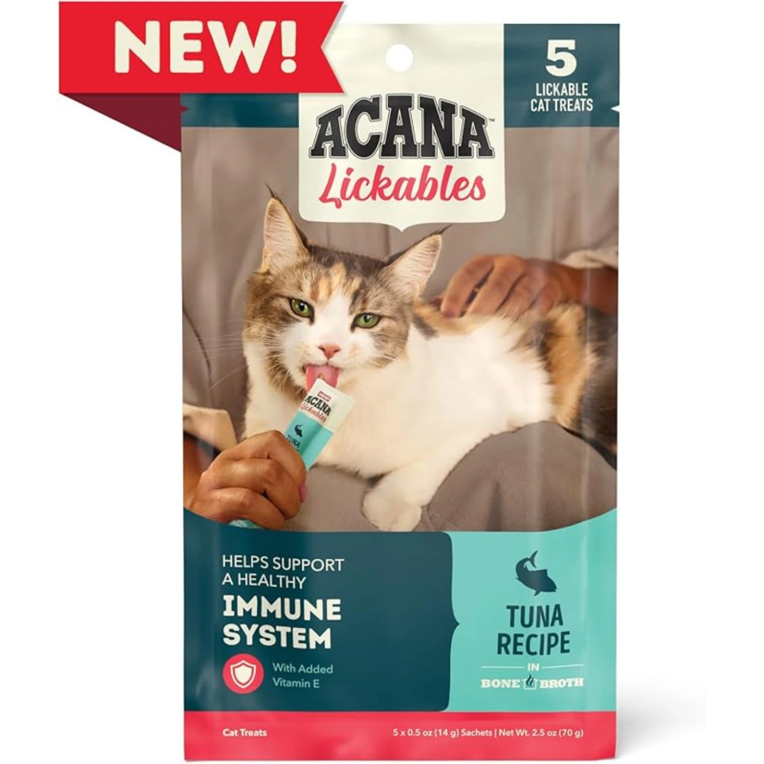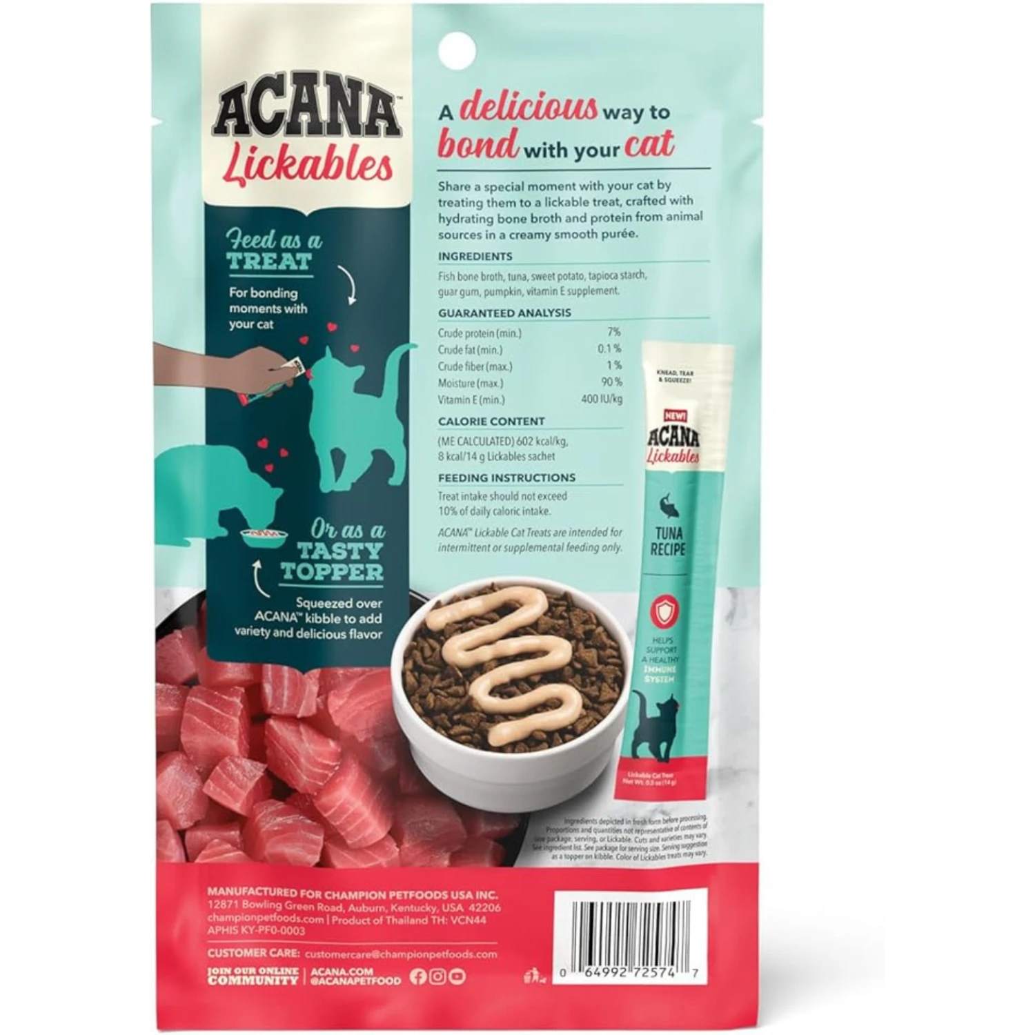 Share a special moment with your cat by treating them to delicious ACANA™ Lickables! Crafted with protein-rich animal ingredients and hydrating bone broth, Lickables treats will tempt your cat to come closer and purr with enjoyment as they bond with you and experience a burst of flavor. These treats are the perfect texture for hand feeding – simply knead, tear and squeeze the pouch to feed your cat a delicious purée, without any mess. Our Tuna Recipe also helps support immune health, giving your cat benefits in every pouch. Your cat will love this creamy, smooth purée, and you’ll love getting closer to your favorite furry friend!