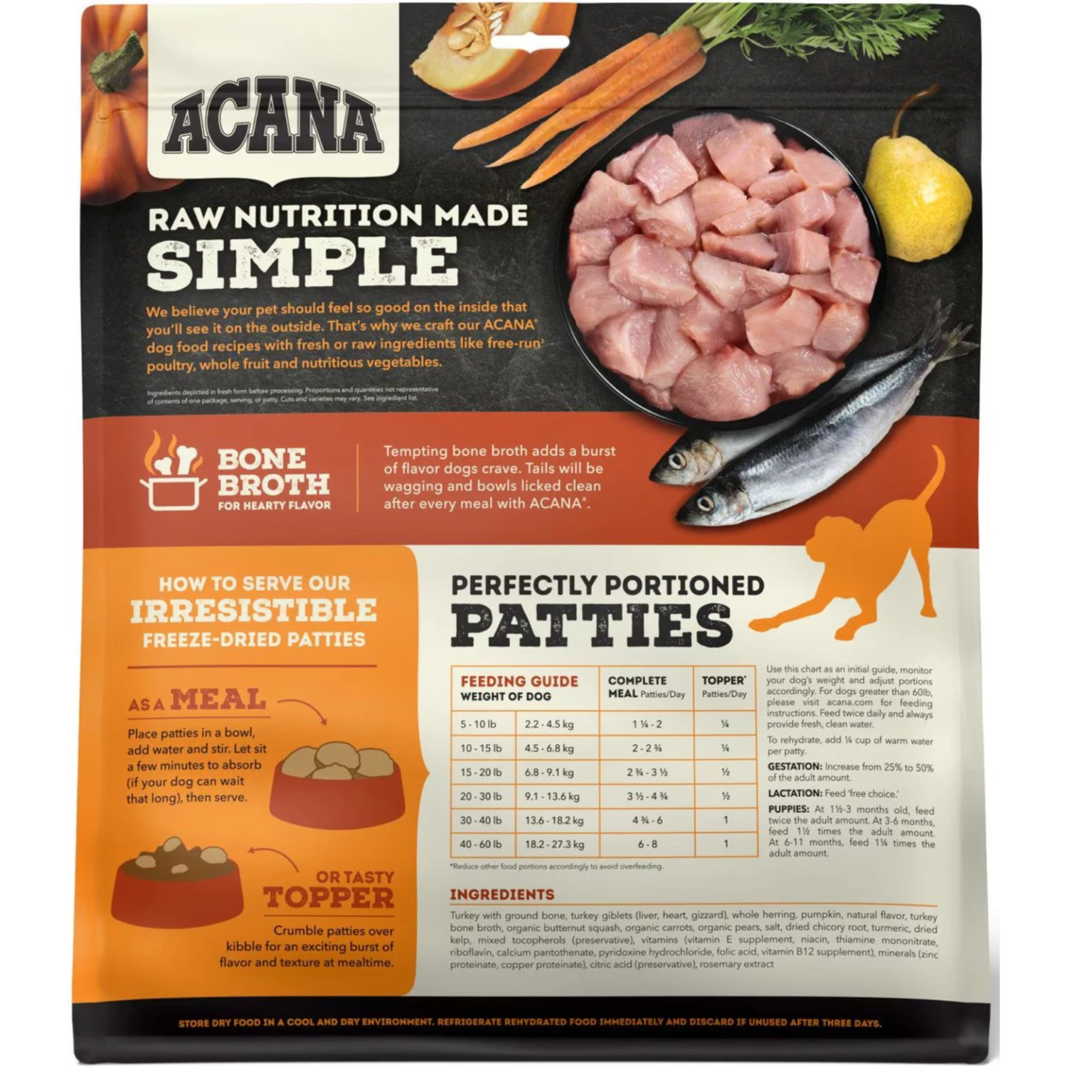 ACANA™ Freeze-Dried Food gives your dog all the benefits of raw nutrition, with none of the mess! Available in bite sized morsels or breakable patties, our Free-Run* Turkey Recipe satisfies your dog’s natural cravings in a convenient, freeze-dried form. It’s made from 90% quality animal ingredients** including free-run turkey, organs bone and broth, and balanced with wholesome vegetables and fruit. It’s also infused with hearty and delicious bone broth for a taste dogs love. Satisfy your dog’s cravings with the nutritious animal ingredients in ACANA Freeze-Dried Food!