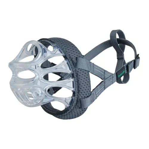 Introducing INVISA, the next generation of basket muzzle, designed to empower owners to confidently walk their dogs in public, providing peace of mind for safety and comfort with a transparent design that reduces the stigma associated with traditional muzzles. Crafted from durable thermoplastic rubber, INVISA redefines the basket muzzle with advanced features prioritizing functionality and canine well-being. Engineered using computer optimization techniques, INVISA is lighter and stronger than traditional muzzles, with a 360° padded basket for enhanced comfort. Designed with versatility in mind, INVISA includes a removable guard to prevent unwanted behaviors like food scavenging and licking. INVISA allows dogs to pant, drink, enjoy treats and even vomit, ensuring their comfort and safety.