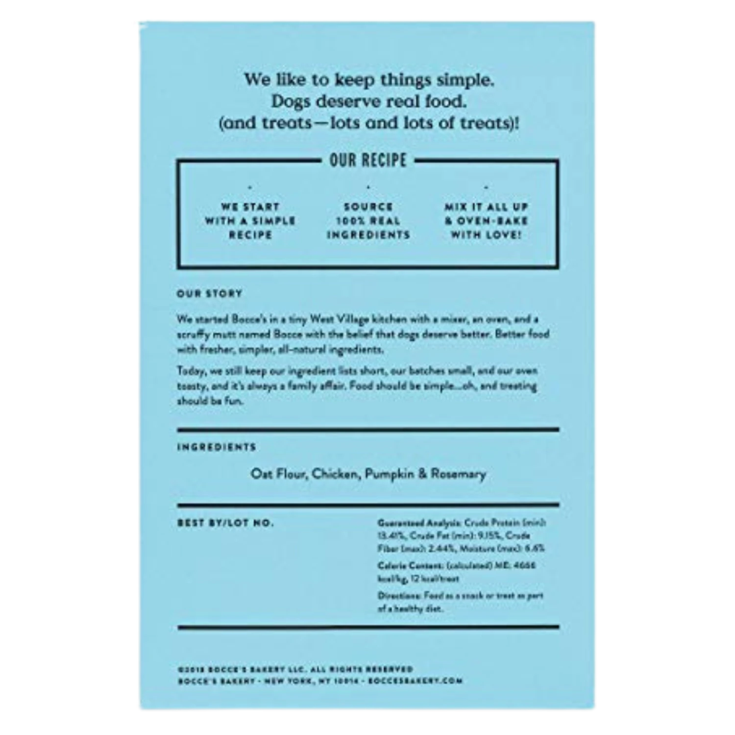 Upgrade treat time by rewarding your canine companion with Bocce’s Bakery Oven Baked Wheat Free Chicken Recipe Dog Treats. These crunchy, limited-ingredient goodies are oven-baked in the USA with real ingredients that are completely recognizable. They are 100% free of wheat and are only crafted with oat flour, chicken, pumpkin and rosemary—that’s it! Now you and your paw-tner can focus on the simple goodness without worrying about nonsense fillers or by-product meals!