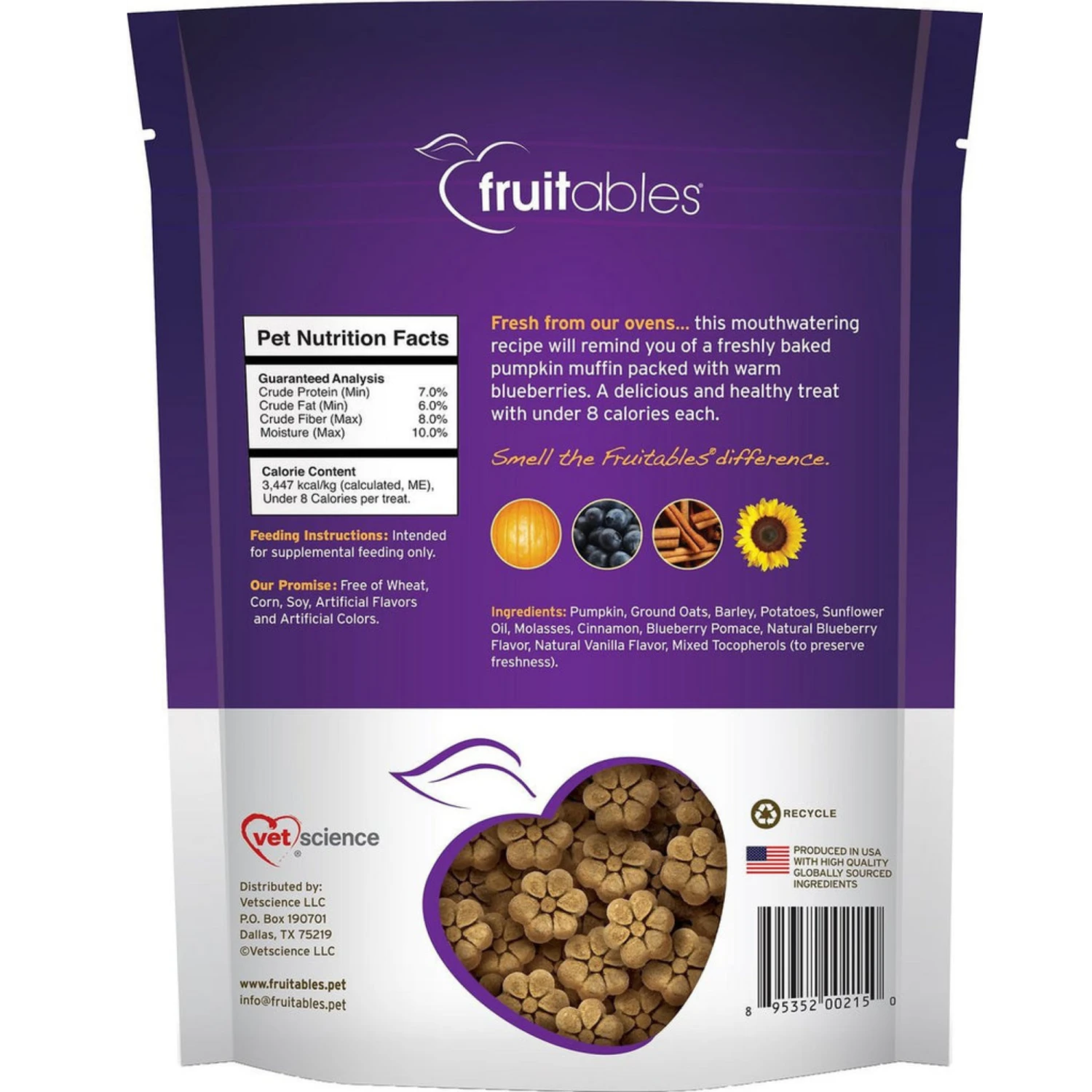 Fresh from the ovens in their certified organic bakery, this mouthwatering recipe will remind you of a pumpkin muffin packed with warm blueberries freshly baked into a delicious crunchy treat. With less than 9 calories each, these treats are the perfect guilt-free indulgence for your lovable dog. Fruitables treats come in different textures and a variety of flavors as broad as the rainbow – go ahead, explore the deliciously healthy world of Fruitables!
