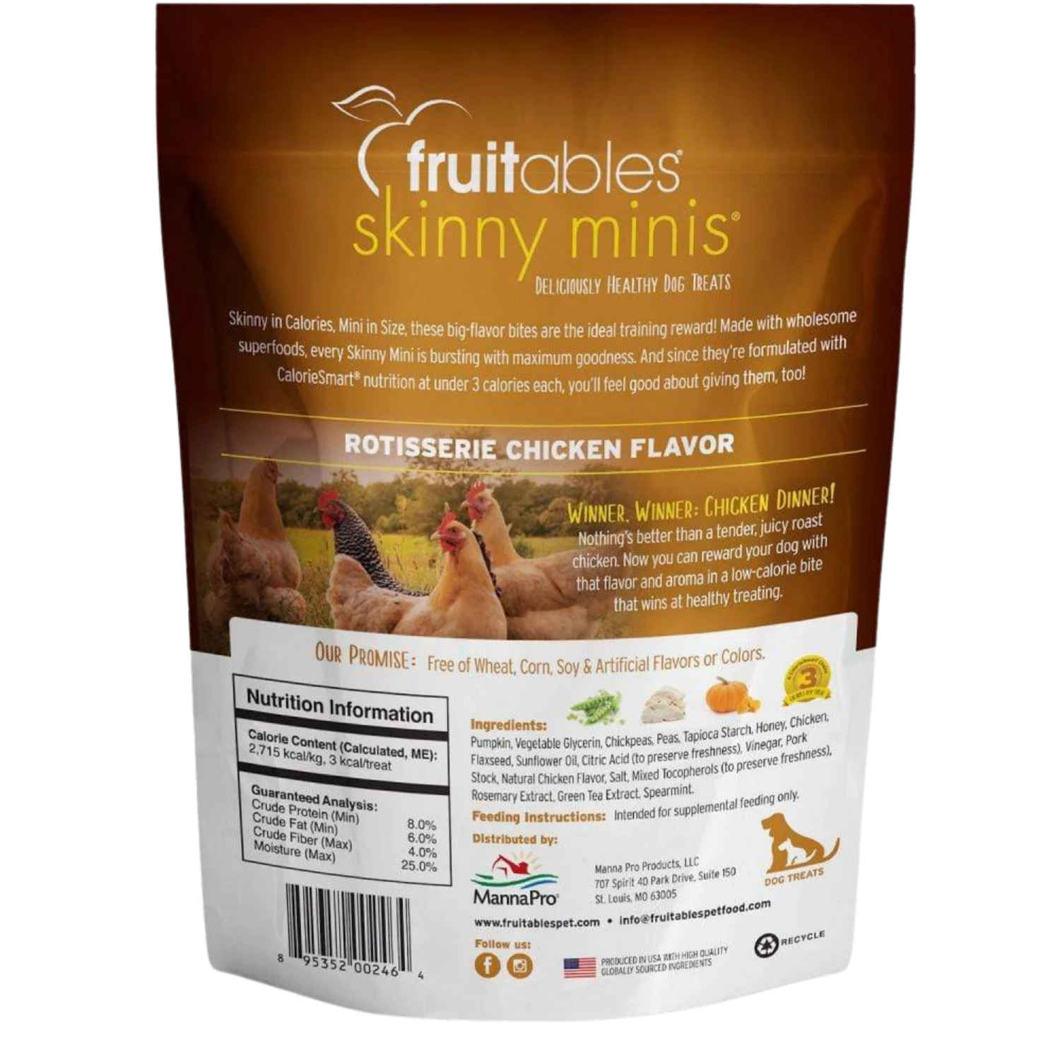 At Fruitables, they make treats that taste as good as they smell. The smell and taste of a slow-roasted chicken with its caramelized juices and tender texture is everyone’s favorite. These Skinny Minis combine that same great taste & aroma in a a calorie smart pumpkin recipe that is perfect for everyday treating. Fresh from their certified organic bakery, Fruitables treats come in different textures and a variety of flavors as broad as the rainbow – go ahead, explore the deliciously healthy world of Fruitables!