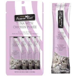 Reward your feline friend with the purr-worthy taste of these creamy Fussie Cat Tuna with Chicken Puree Lickable Cat Treats! Each individually wrapped tube is filled with a velvety puree that’s crafted with real tuna and chicken for the taste cats love. This grain-free recipe is made without preservatives or colors and it’s highly palatable, so even finicky felines will love it! Serve it as a tasty meal topper or right from the tube as a paw-some snack!