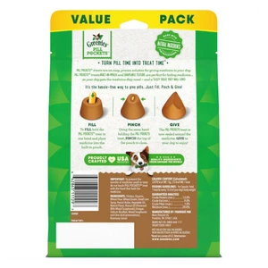 GREENIES Pill Pockets Treats for Dogs make it easy to give your dog medicine, with a tasty real peanut butter flavor they’re sure to love. Why hide your pet’s medicine in human foods like peanut butter or cheese when you can give them a healthy all natural dog treat, made with natural, real ingredients plus trace nutrients instead? Designed by veterinarians, GREENIES Pill Pockets Dog Treats mask the smell and taste of any medicine, taking the stress (and mess) out of giving your canine companion medicine. Whether for large breed or small dogs, these smaller-sized Pill Pockets for tablets make taking medicine a positive experience for your dog. And they’re easy to give: Simply drop a tablet into the Pill Pockets pouch, pinch the top half closed, give it to your pup, and poof: Watch their medicine disappear.