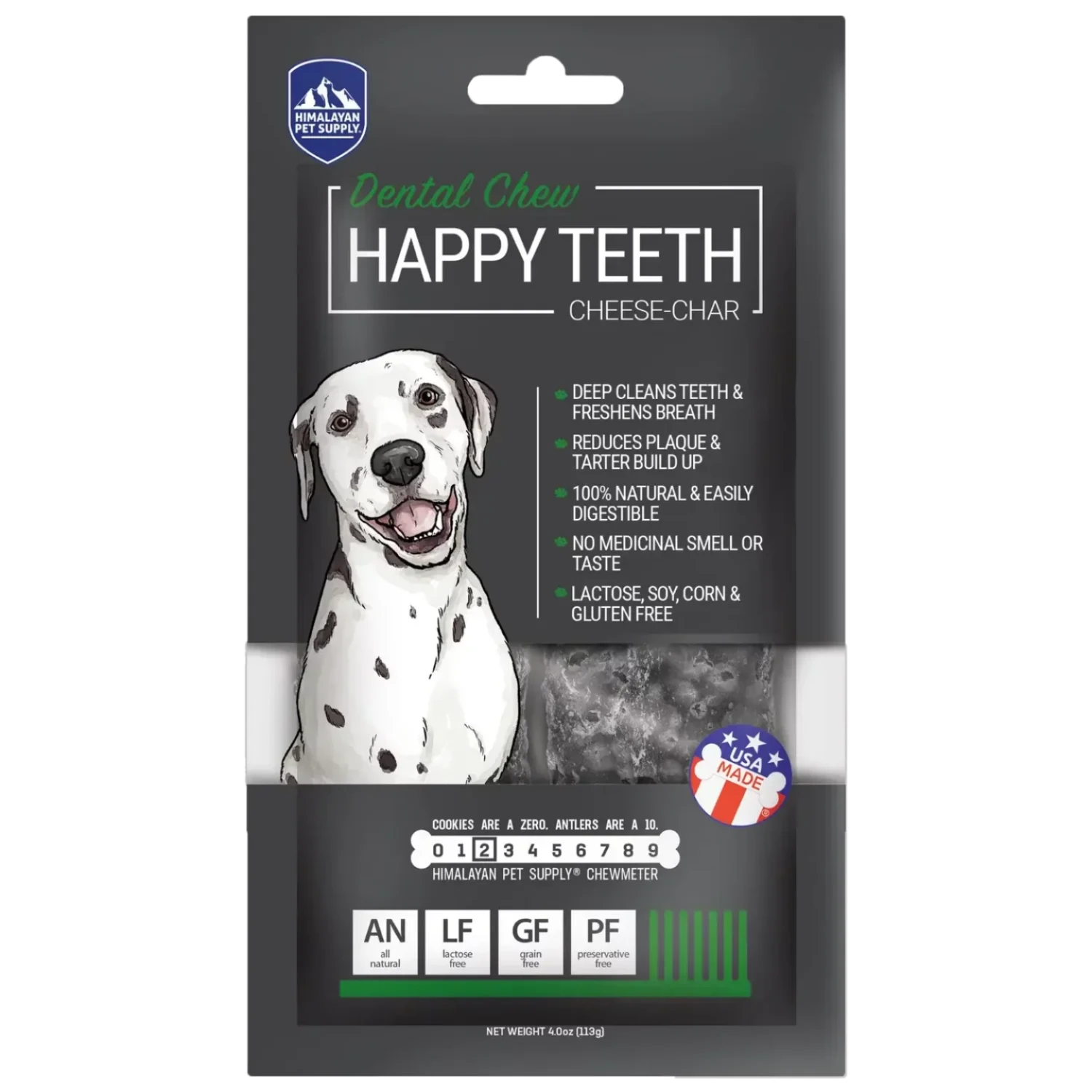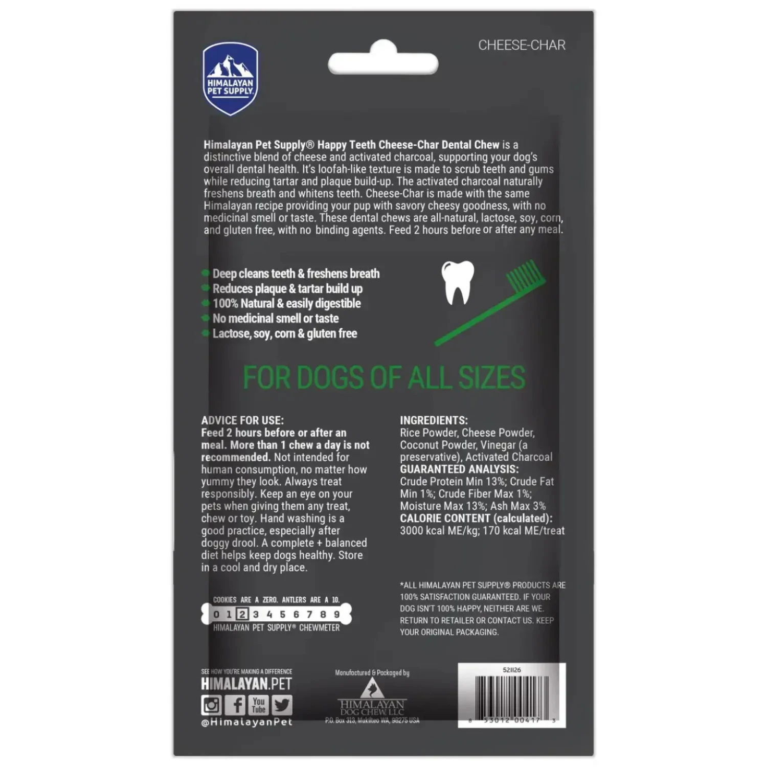 Happy Teeth Cheese-Char Dental Chew is a distinctive blend of cheese and activated charcoal, supporting your dog’s overall dental health. Its loofah-like texture scrubs teeth and gums while reducing tartar and plaque build-up. The activated charcoal naturally freshens breath and whitens teeth. Cheese-Char is made with the same Himalayan Cheese recipe providing your pup with a savory, cheesy chewing experience. With no medicinal smell or taste, these dental chews are all-natural, lactose, grain, soy, corn, and gluten-free, with no preservatives or binding agents. Feed 2 hours before or after any meal.