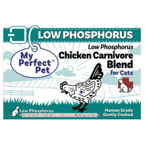 - 89% protein from Chicken — at My Perfect Pet, we care about the compassionate treatment of all animals, and are working to ensure that our chicken ingredients are sourced from welfare-certified farms and that our Low Phosphorus Chicken Carnivore Blend earns a certification recognized by the ASPCA®’s Shop With Your Heart® program by 2027.