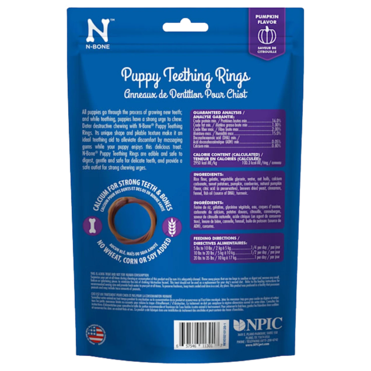 Growing new teeth is tough work and it makes for some sore gums! Sore gums and a strong urge to chew while cutting new teeth can turn your precious puppy into a whirlwind of destruction. N-Bone® Puppy Teething Rings are easy for floppy puppy paws to hold onto and provide a soothing and appropriate outlet for chewing. Formulated with DHA and calcium to support your puppy’s unique nutritional needs, our delicious pumpkin flavored rings are pliable and won’t damage immature teeth.