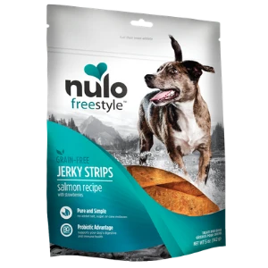 Make training delicious and nutritious with the Nulo Freestyle Grain-Free Salmon Recipe With Strawberries Jerky Dog Treats. Every bite is loaded with salmon as the first ingredient plus wholesome strawberries, and a boost of goodness from probiotics to support your dog’s digestive and immune health. Tear them into bite-sized pieces for training, or treat your pal to a whole jerky when he’s been extra good! They’re slow-cooked to perfection in a natural smokehouse for a flavor your pal will jump, sit, and stay for, and they have none of the extra calories from sugar or cane molasses. Plus, they’re made in the USA with no grains, added salt, corn, wheat, gluten, soy, artificial preservatives, colors or flavorings.