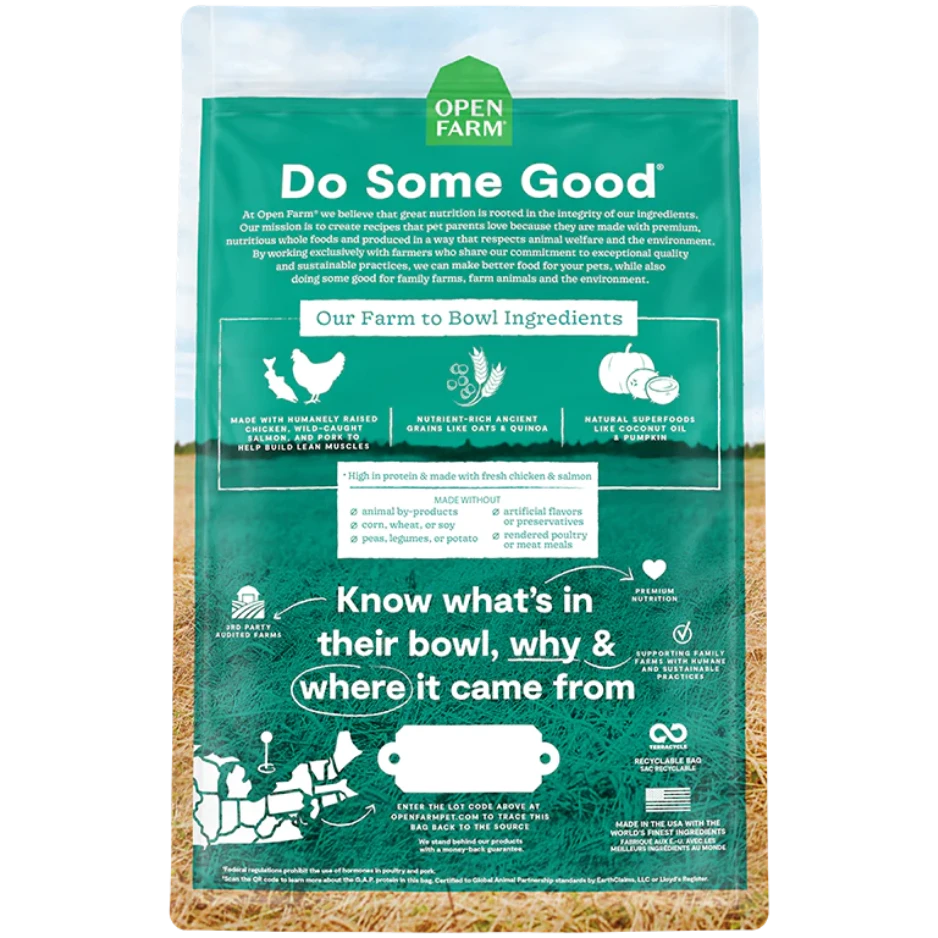 This high-protein kibble helps prevent allergies and supports DHA healthy brain development, thanks to a blend of humanely raised chicken, pork, and fresh Pacific wild-caught salmon, and wholesome ancient grains.