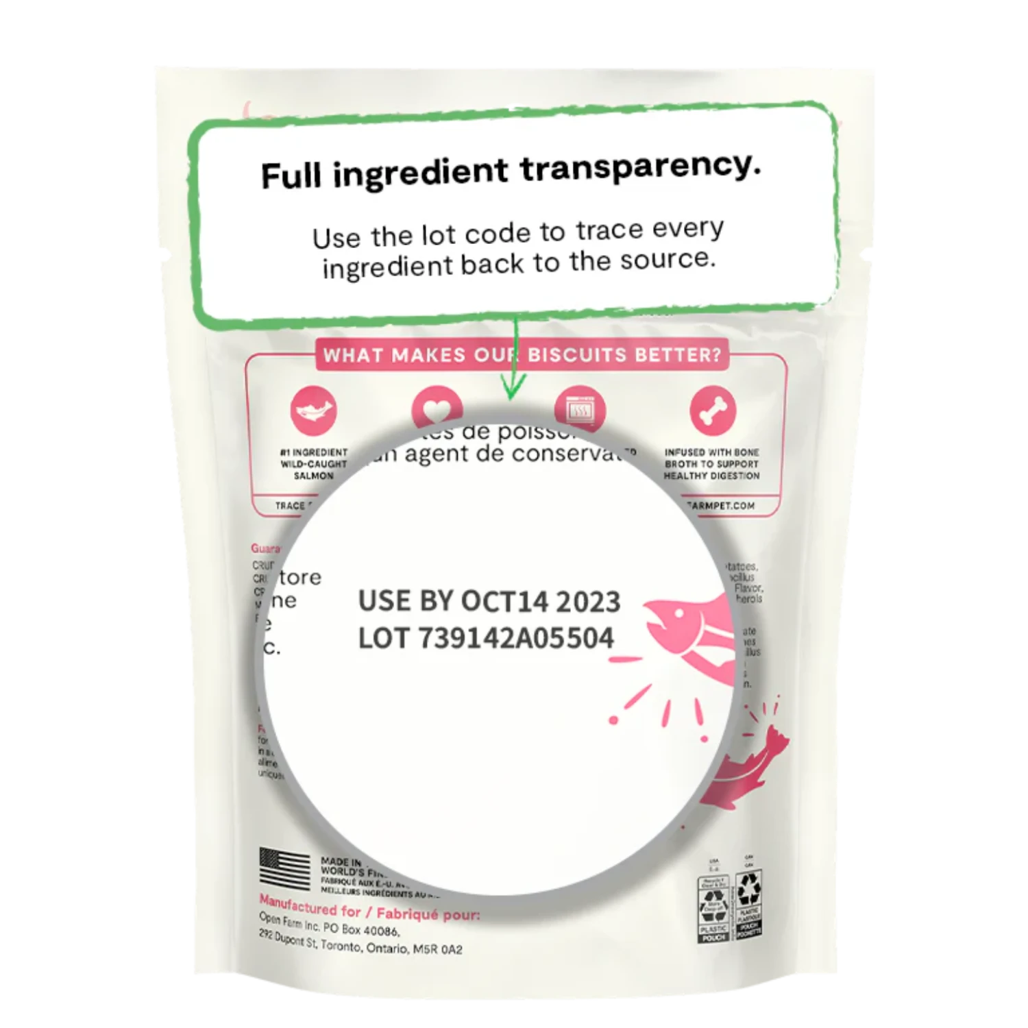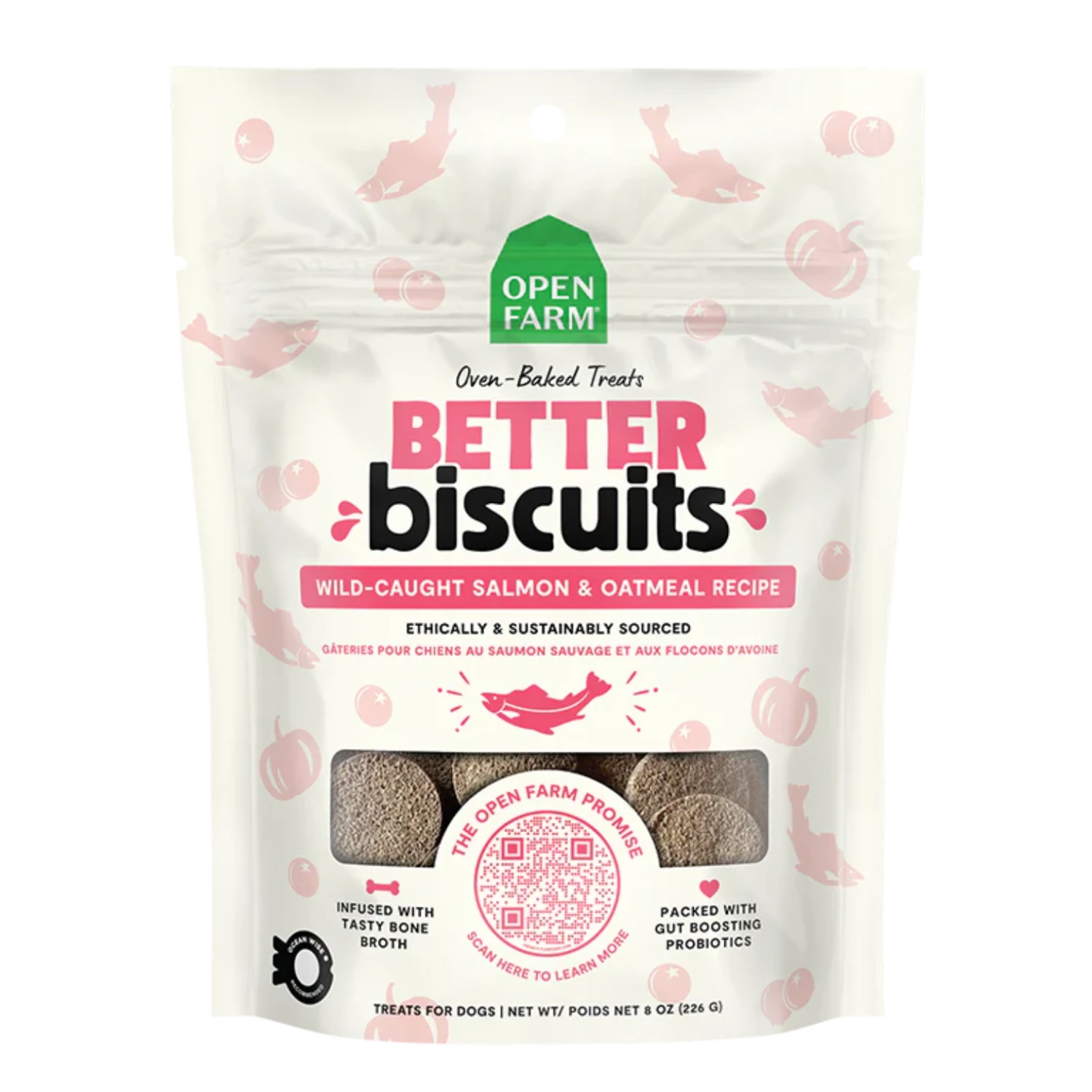 What makes our biscuits better? Our wild-caught salmon & oatmeal recipe treats are made with Ocean Wise recommended salmon as the first ingredient and are combined with superfoods like pumpkin & sweet potato to deliver a crave-worthy taste. These treats are gently oven-baked for a crunchy treat, packed with probiotics to support a healthy gut, and infused with bone broth to support healthy digestion, making them a perfect reward for your pup!