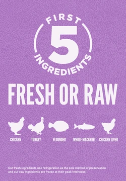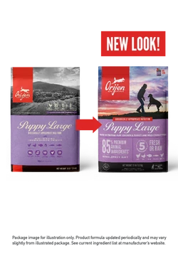 With 38% richly nourishing protein, and limited to 20% low-glycemic carbohydrates to nourish large breed puppies according to their evolutionary and biological needs. Free of rendered poultry meals, 1/3 of the meats are from dehydrated chicken and turkey (air-dried at low temperature from fresh meat) for a concentrated source of nourishing protein. Unmatched by any other food, 2/3 of the meats are FRESH (refrigerated, without preservatives) or RAW (flash-frozen, without preservatives), including the top 10 meat ingredients. Nutrient-dense WholePrey™ ratios of fresh meats, organs, and cartilage plus fresh whole fish and fresh whole eggs provide a natural source of virtually every nutrient your puppy needs. Infusions of gently freeze-dried liver enhance flavor and palatability naturally, making ORIJEN deliciously tasty, even for fussy pups.