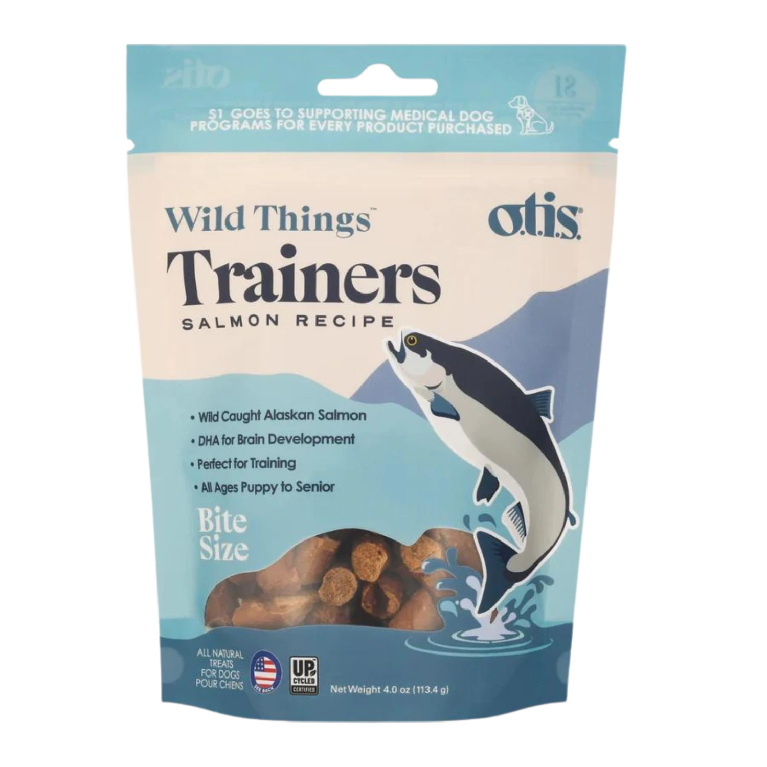 This 4-ounce, resealable bag of Salmon dog training treats is a pantry must. O.T.I.S. Wild Things Trainers are bite-sized functional training treats made with ashwagandha, L-Theanine, and DHA for cognitive development. Perfect for all dogs of all sizes and ages.