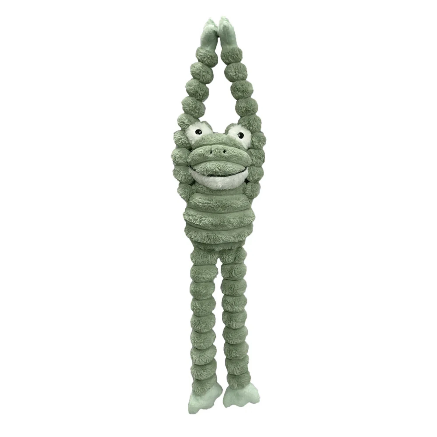 - 36″ frog-shaped dog toy can be hung by the hands.