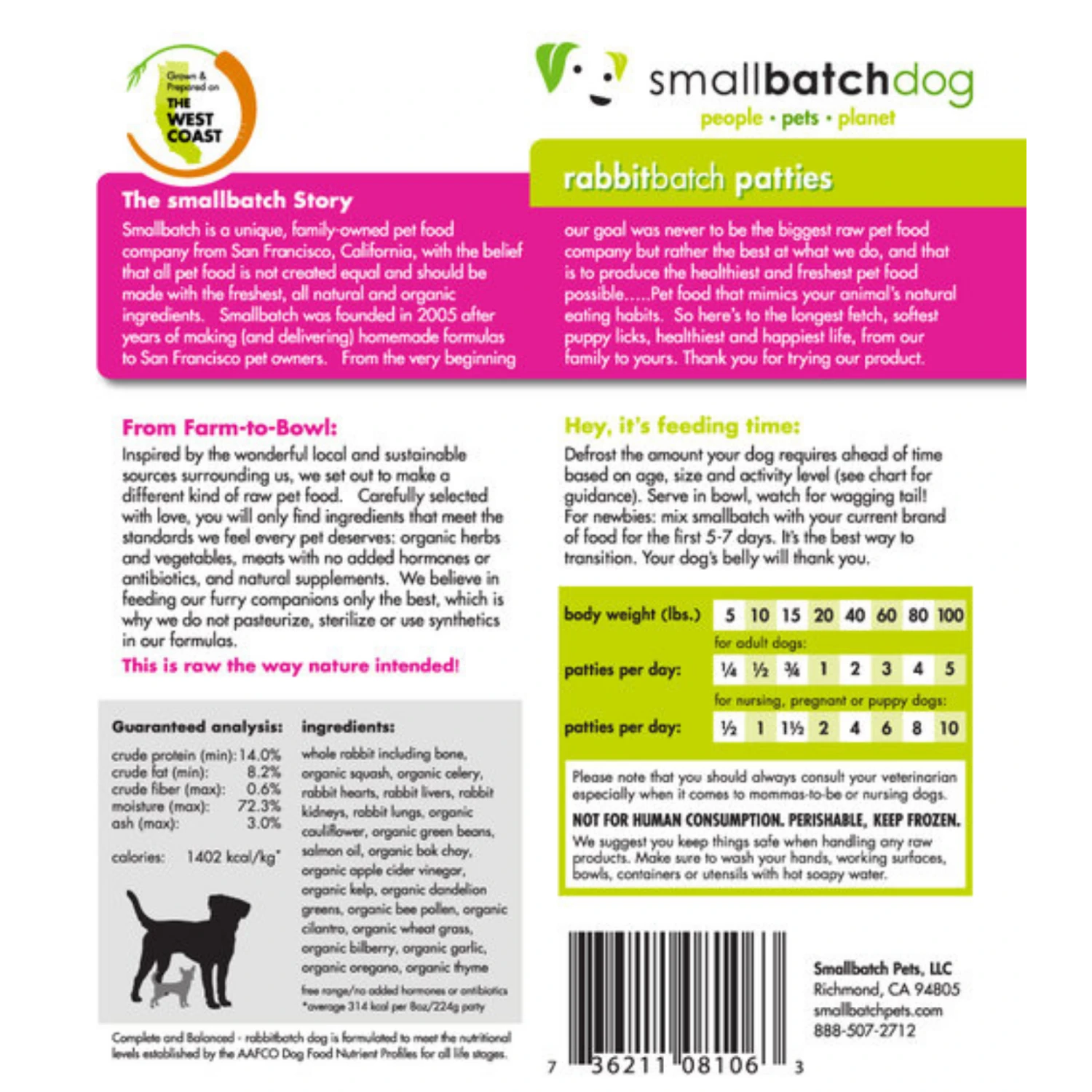 Feed your dog the pure raw way mother nature intended with convenient Frozen Dog Food from Smallbatch! Smallbatch is an independent family-owned company in the Bay Area of California that utilizes local and sustainable sourcing to provide your pet with the very best in raw feeding! Only made with the highest quality organic non-GMO ingredients for the freshest and most nutritious raw meals that your pet will love! Smallbatch’s raw diets use a limited-ingredient single-protein formula featuring 78-88% meat, organ and bone. Only made with meat that is humanely USA-sourced and antibiotic and hormone-free. Smallbatch proudly features no mechanically separated meat. All essential vitamins, minerals, and amino acids come from organic wholefood sources. Features convenient individual patties for easy feeding and portion control! Your dog will be licking their lips after tasting theses delicious raw diets! No Root Vegetables. Made in USA.