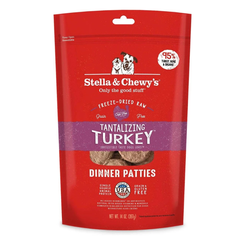 Give your dog what he naturally craves with Stella & Chewy’s Tantalizing Turkey Dinner Patties Freeze-Dried Raw Dog Food. Based on the philosophy that dogs thrive on the same diet they would eat in the wild, this all-natural recipe makes it easy to feed your best friend only the good stuff. Made from sustainably-sourced ingredients and raw, single-source protein, this recipe starts with 95% cage-free turkey, organs, and bone plus 100% certified-organic fruits and vegetables—offering the benefits of raw food nutrition with the convenience of freeze-dried preparation. And to ensure the highest quality, each batch is made with care in Stella & Chewy’s own U.S. kitchen.