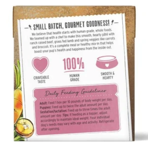 We believe that health starts with human grade, whole foods. We teamed up with a chef to make this smooth, hearty Butcher Block Pâté with ranch raised beef, grass fed lamb and spring veggies like carrots and broccoli. This gourmet wet food can be served as a complete meal or healthy mix in that helps you boost your pup’s health and happiness from the inside out.