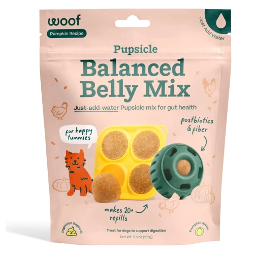 Designed to support digestion and help sensitive tummies, this just-add-water Pupsicle pop mix combines prebiotics like Microbuild™ to nourish gut bacteria and postbiotics like Tynagen™ to promote a healthy gut lining. Pumpkin provides natural fiber to help regulate digestion and firm up stools, while hydrolyzed chicken offers a gentle, easily digestible protein for pups with sensitivities or allergies. Each bag makes 20+ refills so you can offer your pup delicious pops on repeat.